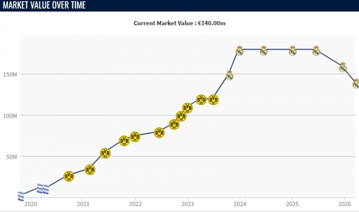 世俱杯2025-两连跌!22岁贝林身价再跌2000万降至1.4亿,去年巅峰身价1.8亿欧